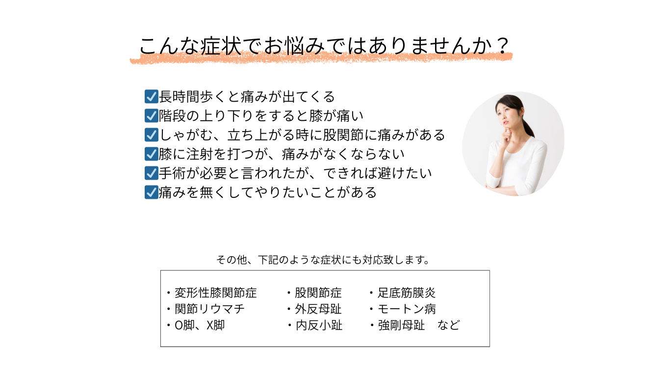 ・一般                (関節症や足の痛みの改善、歩行・姿勢矯正、腰痛や肩こり、頭痛の改善)